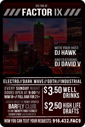 Join us every Sunday Night for the longest, currently running, weekly "goth" club in Sacramento. Drink specials every night. Dance to the perfect blend of Classic Clubs Hits (like Depeche Mode, Ministry, Bauhaus, London After Midnight - & much more), Current Future Pop Favorites (Covenant, And One, VNV Nation, Wolfsheim - to name a few), and Cutting Edge NEW Tracks . . . spun by legendary DJ Bryan Hawk and Sacramento's very own DJ David V.